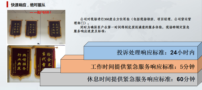 完善的客户沟通渠道 ——与客户进行有效沟通,及时解决客户提出的问题,了解客户需求,规定服务过程中客户满意程度调查频次,及客户投诉的处理程序、职责等。同时,建立全方位的质量监控系统,为客户提供优质的环境服务。